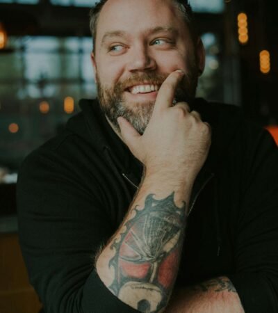 A person wearing a branded cap and shirt is placing a container into an insulated delivery bag. The scene appears to be inside a restaurant with a chef visible in the background near the kitchen. The environment is well-lit with hanging lights and has a modern ambiance.